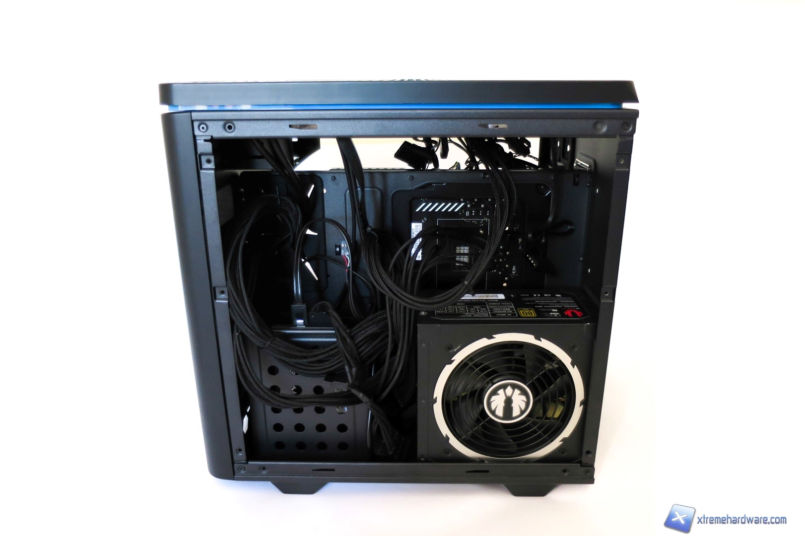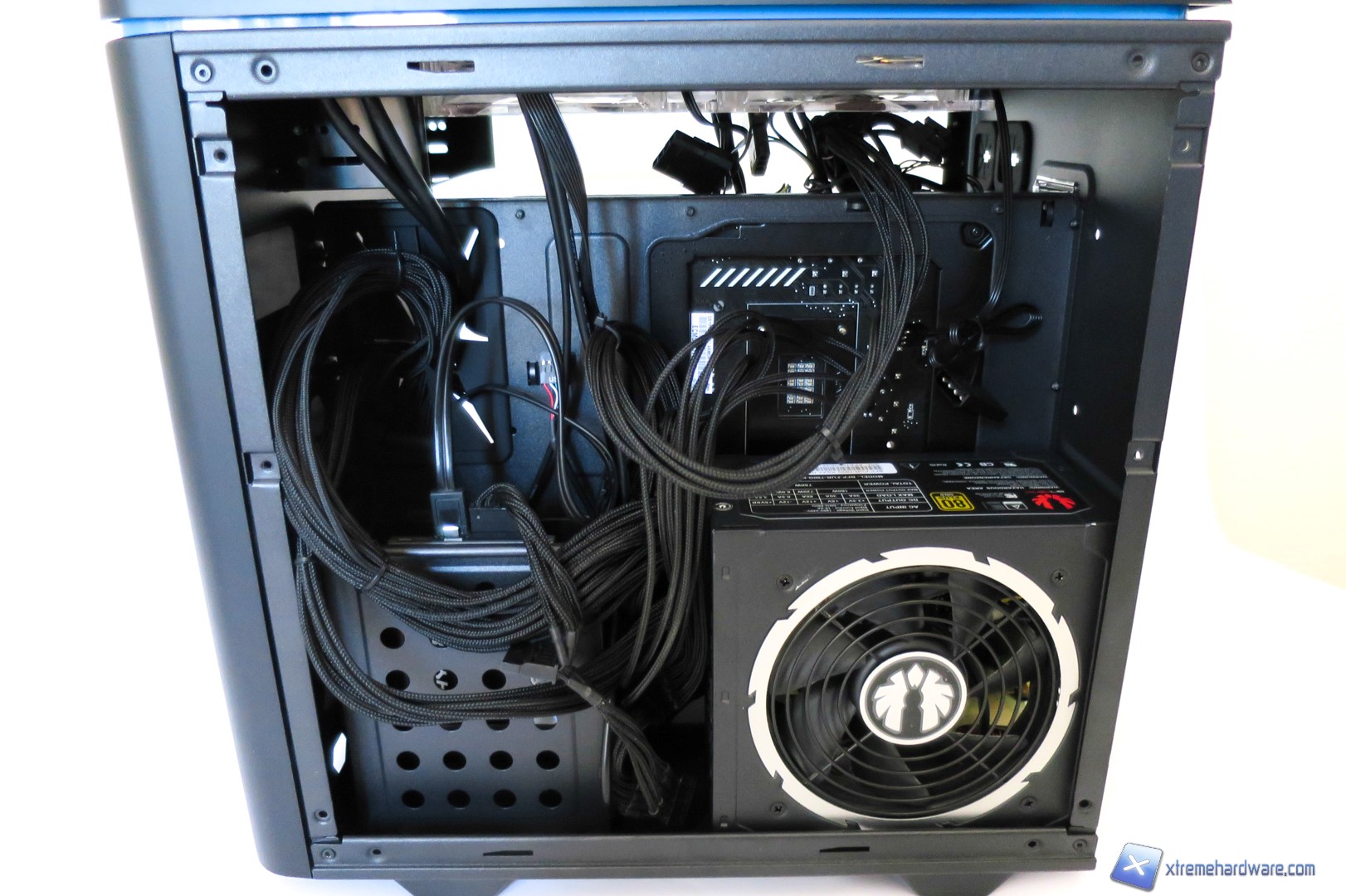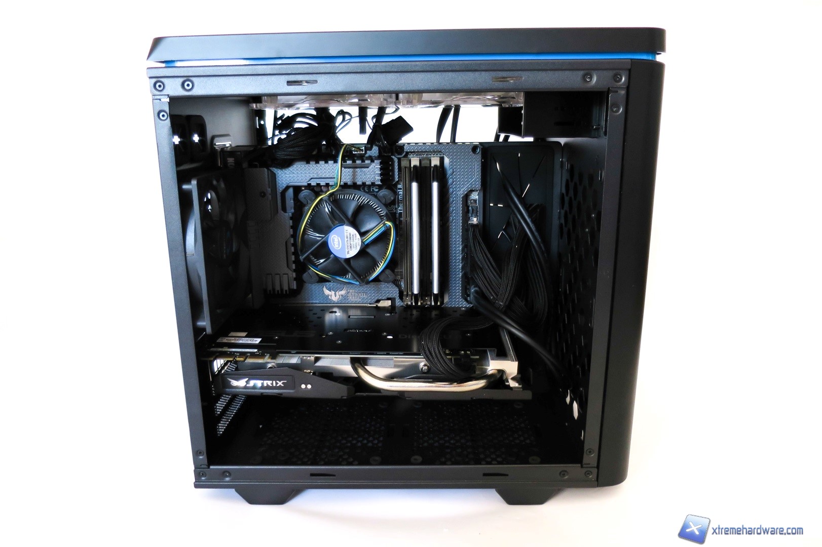 Se si possiede un dissipatore Intel, tramite il solito sistema Push-Pin, sarà possibile installarlo successivamente, così come un dissipatore grazie al generoso foro nel tray della scheda madre. Il foro infatti è molto ampio e permette ogni manutenzione successiva. Dopo aver montato il dissipatore sulla scheda madre, sarà necessario montare la scheda video, le RAM ed infine procedere all’assemblaggio dei cavi di connessione del cabinet alla scheda madre. Essendo un case bicamera potremo, dopo aver installato l’alimentatore, organizzare al meglio tutti i cavi e poi passarli tramite i fori lato tray e connettore tutte le periferiche. Lo spazio è adeguato ed anche il montaggio è veloce.